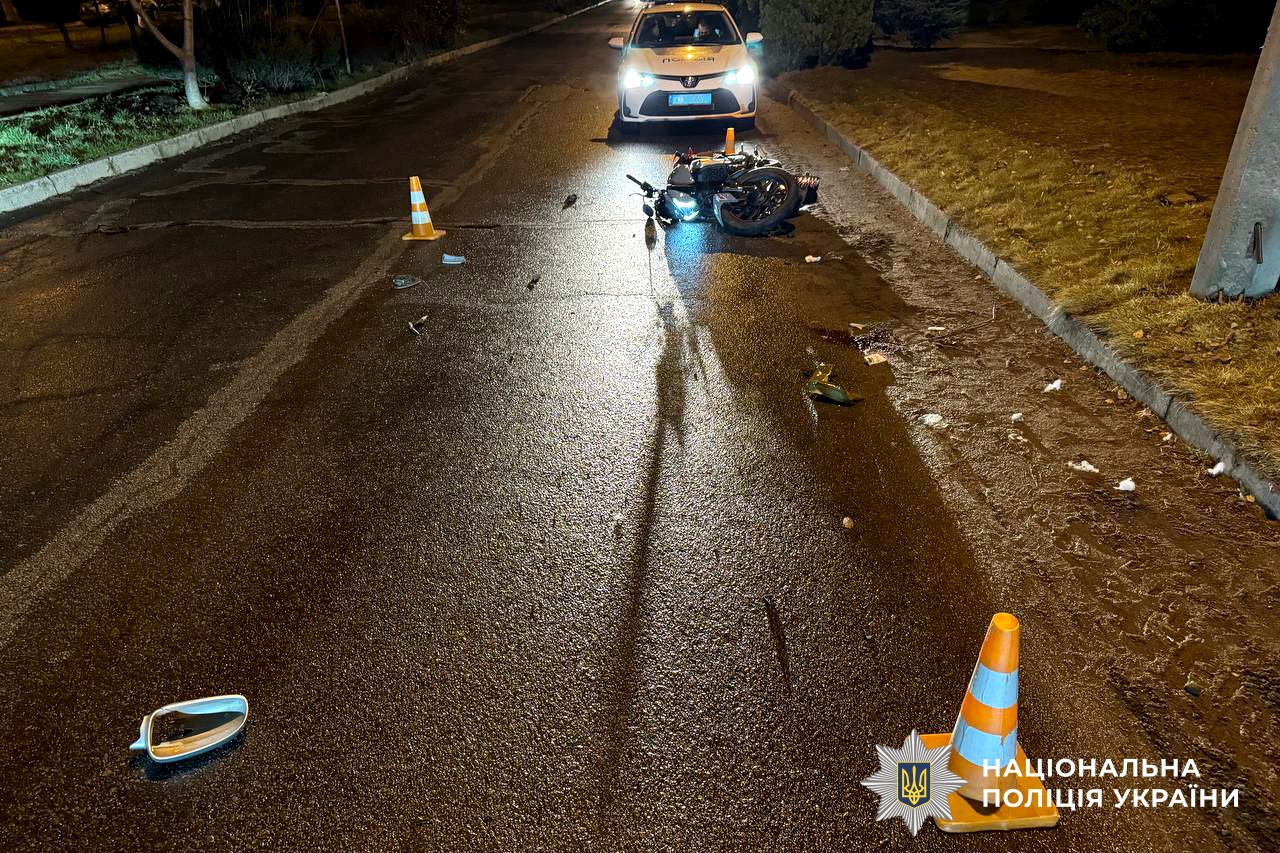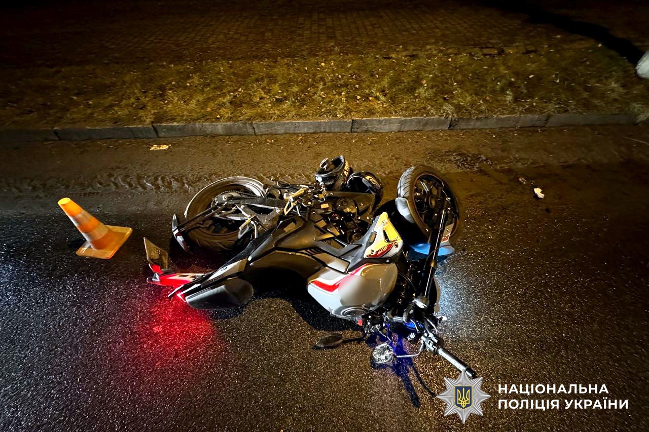 Мотоцикліста госпіталізували до лікарні з відкритим перелом ноги. Відомо, що він був у мотошоломі, однак посвідчення водія відповідної категорії не мав.