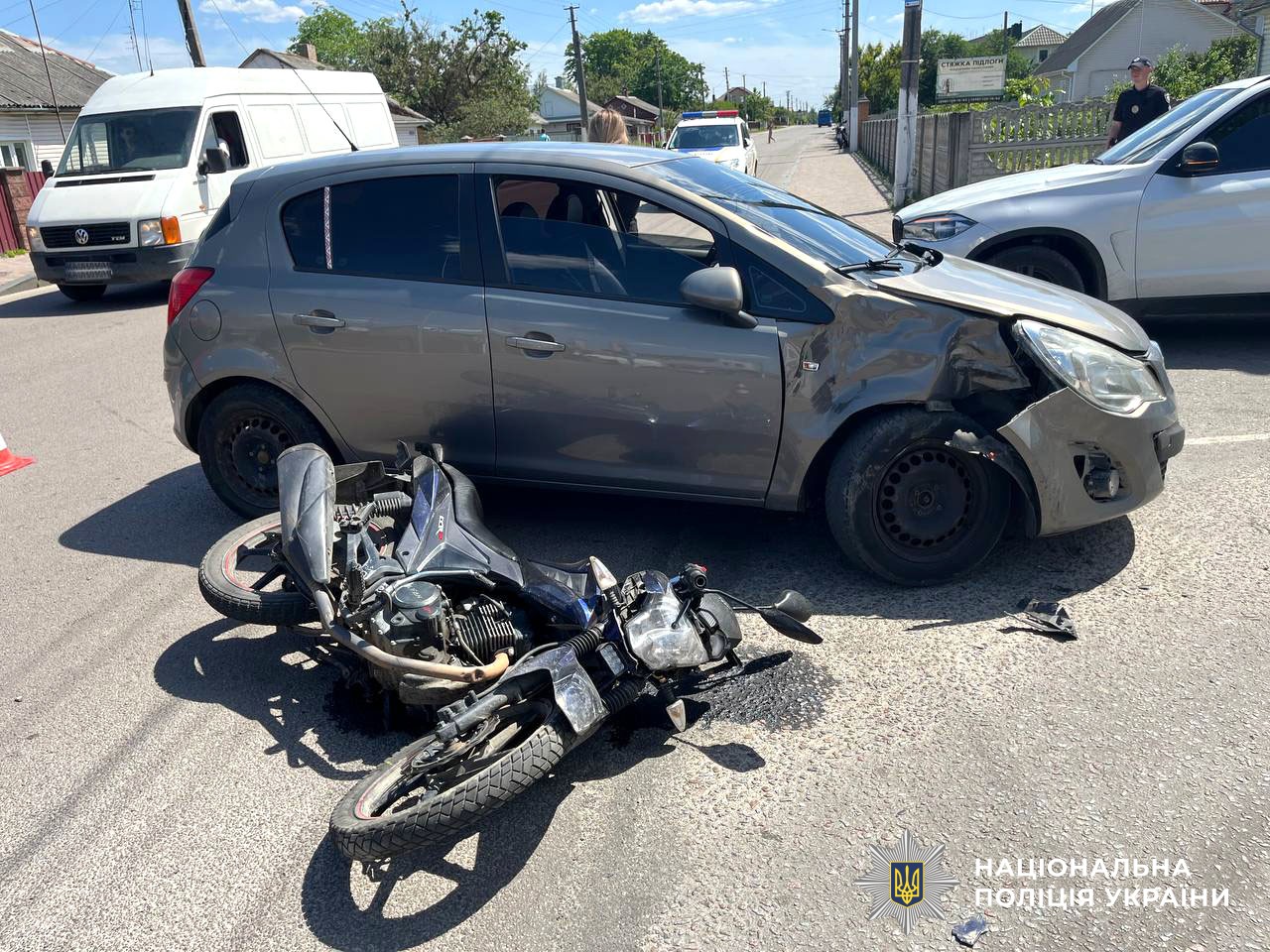 Поліцейські встановили, що 26-річна водійка автомобіля «Opel Corsa», здійснюючи маневр повороту ліворуч на перехресті, не надала переваги в русі та допустила зіткнення з мотоциклом «Lifan» під керуванням 20-річного жителя села Злазне. У водія двоколісного діагностували закритий перелом ноги зі зміщенням.