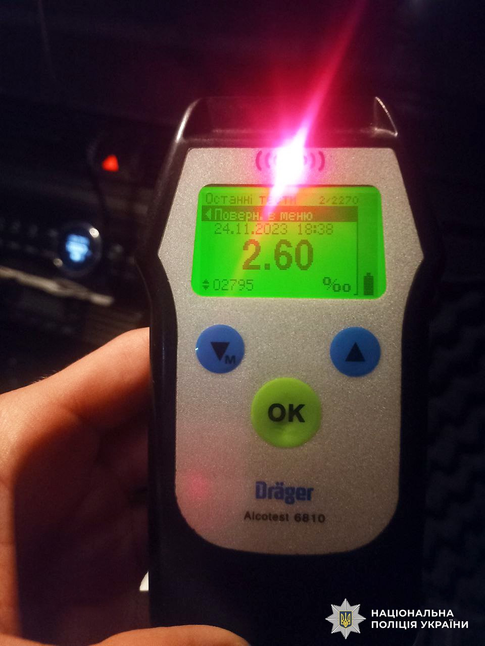 Під час перевірки документів і спілкування із 47-річним кермувальником з’ясувалося, що він перебуває у стані алкогольного сп’яніння, що і підтвердив огляд на алкотестері. Результат перевищив допустиму норму у 13 разів — 2,6 проміле.