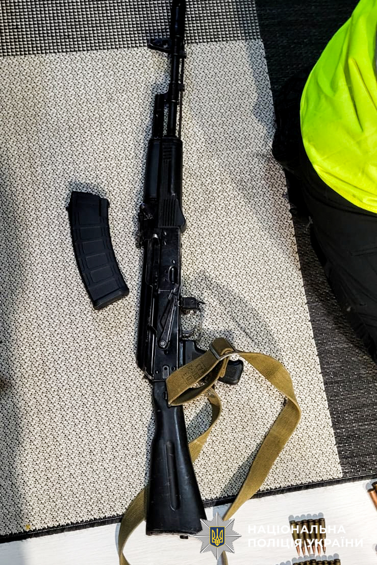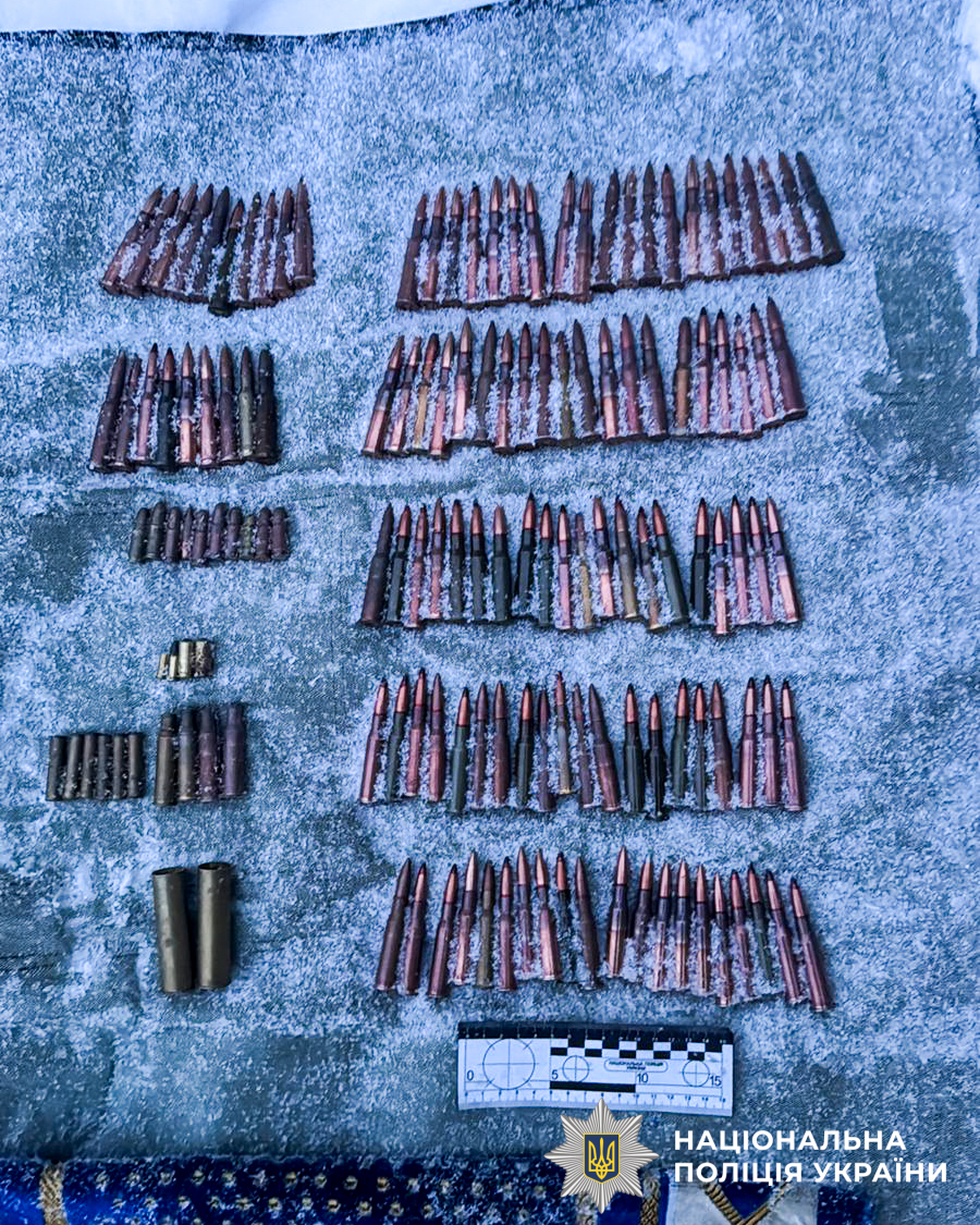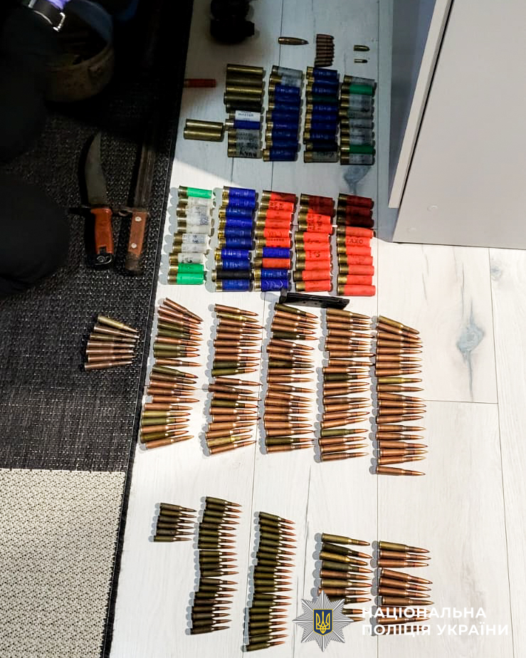 Крім того, під час санкціонованого обшуку за місцем проживання фігуранта, фахівці вибухотехнічної служби поліції області виявили та вилучили автомат Калашникова, три гранати, пристрій для відстрілу гумових куль «Форт-12» з двома магазинами, 293 патрони різних калібрів, два штик-ножі, ручну гранату «ДМ-51» та запал до неї.