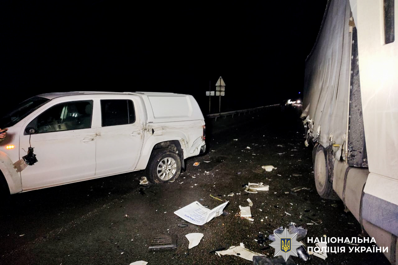 Від удару «DAF» із напівпричепом відкинуло на зустрічну смугу, де вона зіткнулася із такою ж вантажівкою, водієм якої був 31-річний житель Житомирщини.
