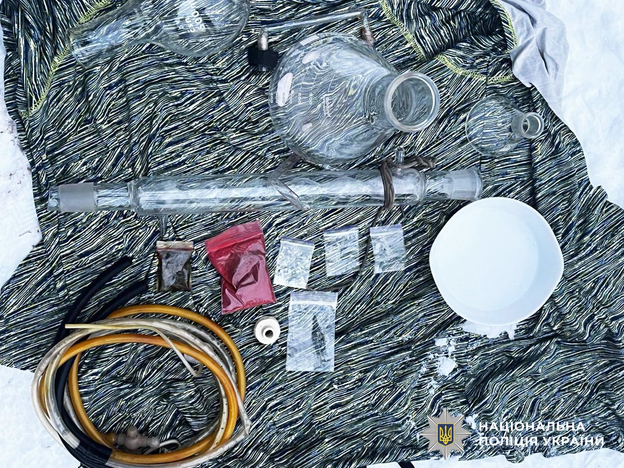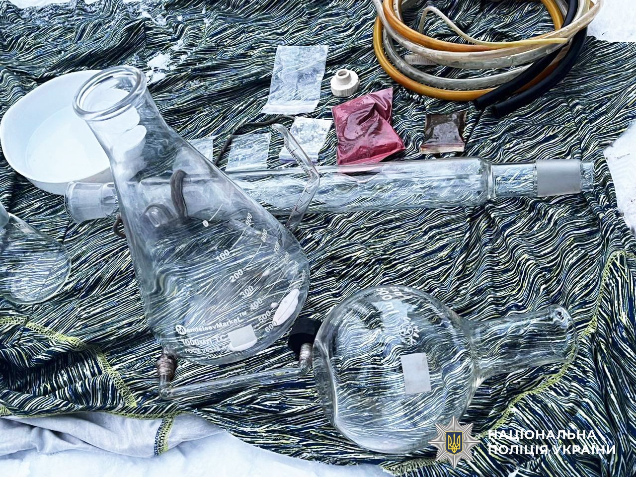 За його місцем проживання оперативники ліквідували нарколабораторію з виготовлення психотропної речовини, а під час обшуку вилучили лабораторне обладнання для виготовлення метамфетаміну, прекурсори та готовий «продукт».