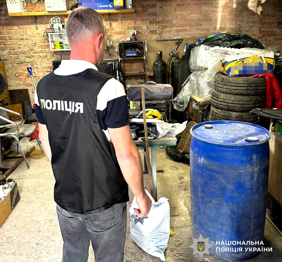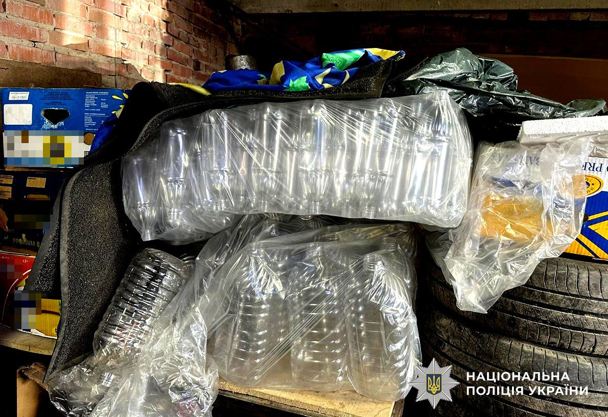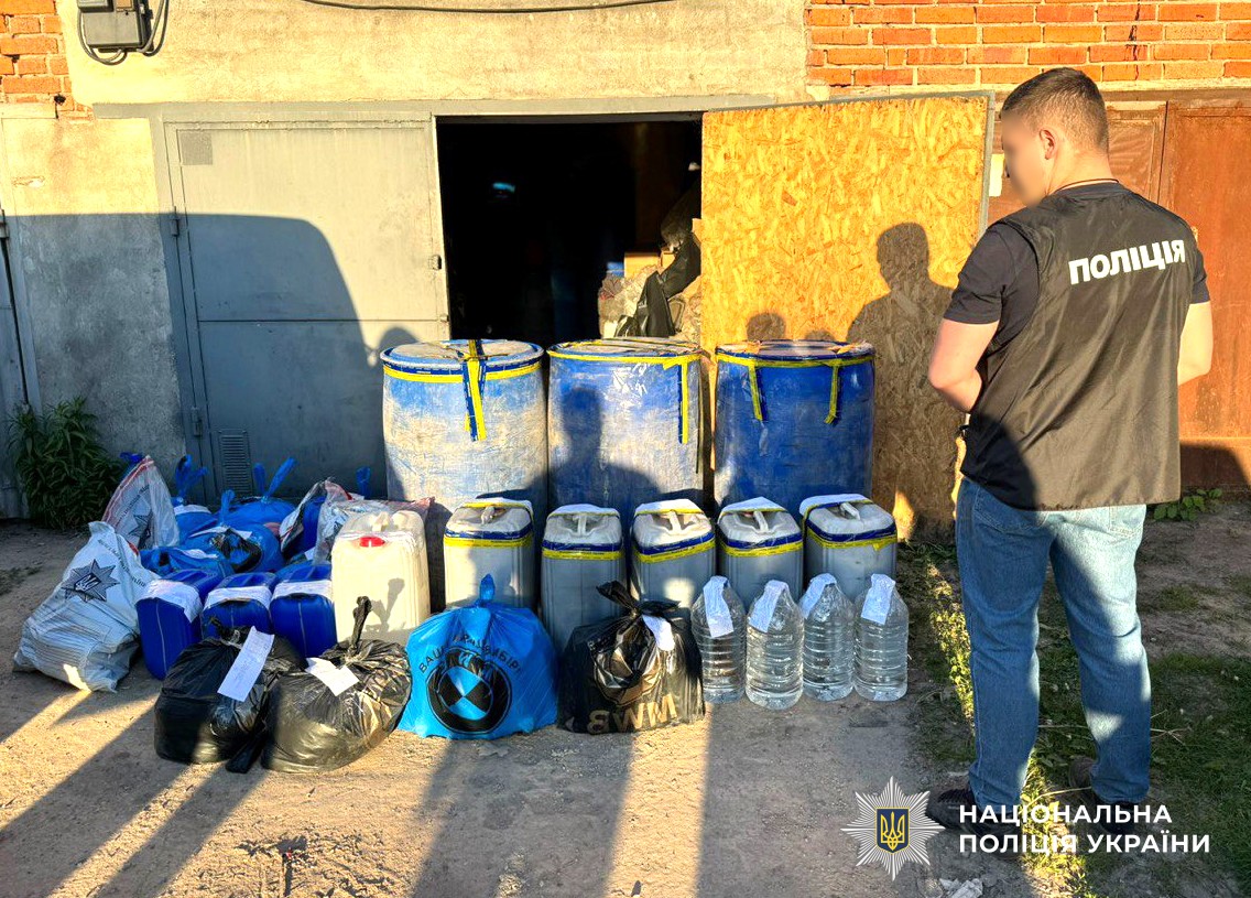 Під час слідчих дій у гаражних приміщеннях вилучено обладнання для виготовлення і розливу алкоголю, 928 літрів рідини з характерним запахом спирту, яка знаходились в пластикових ємностях різного об’єму, три літри ароматизатору та пластикову тару.