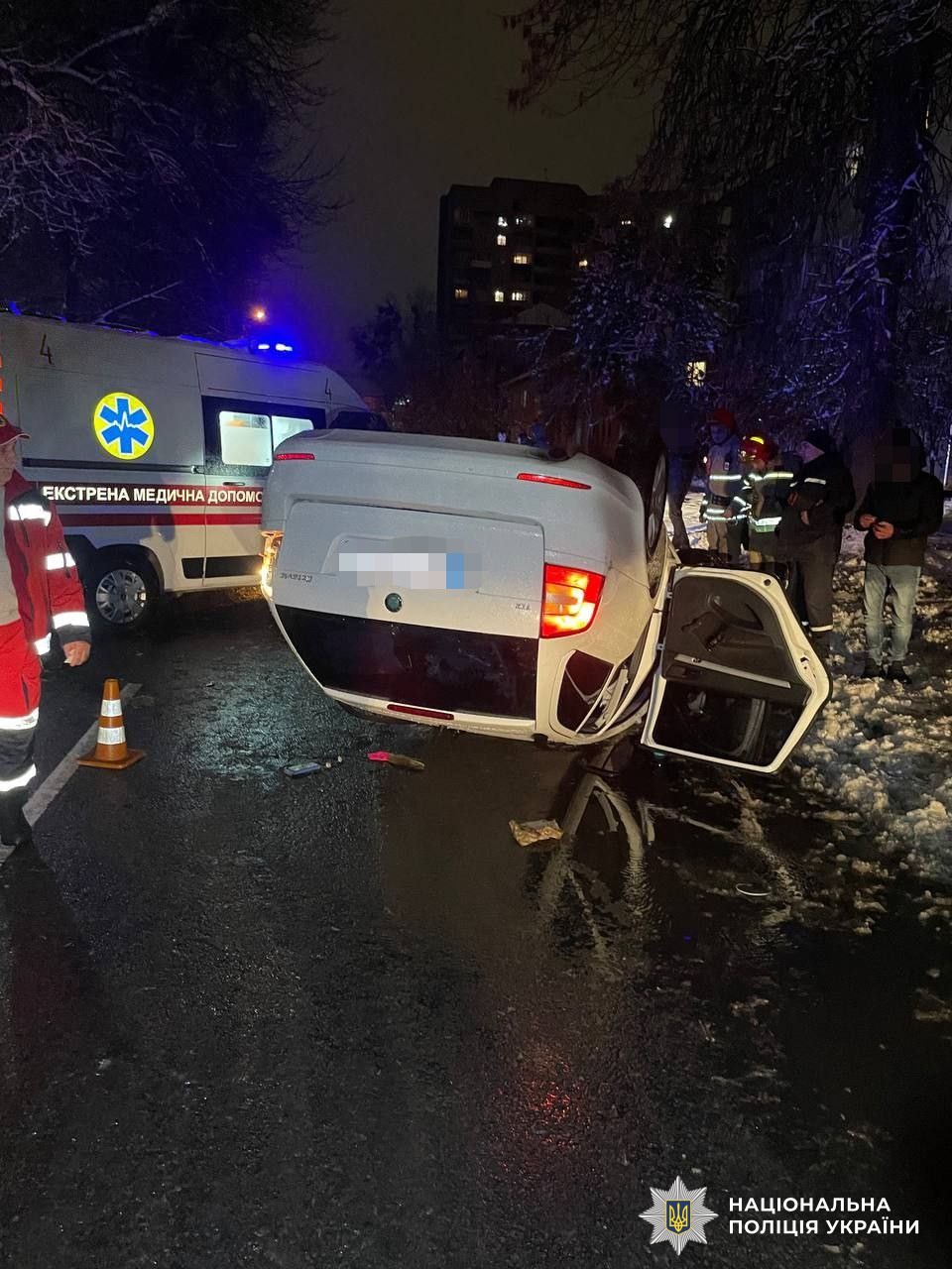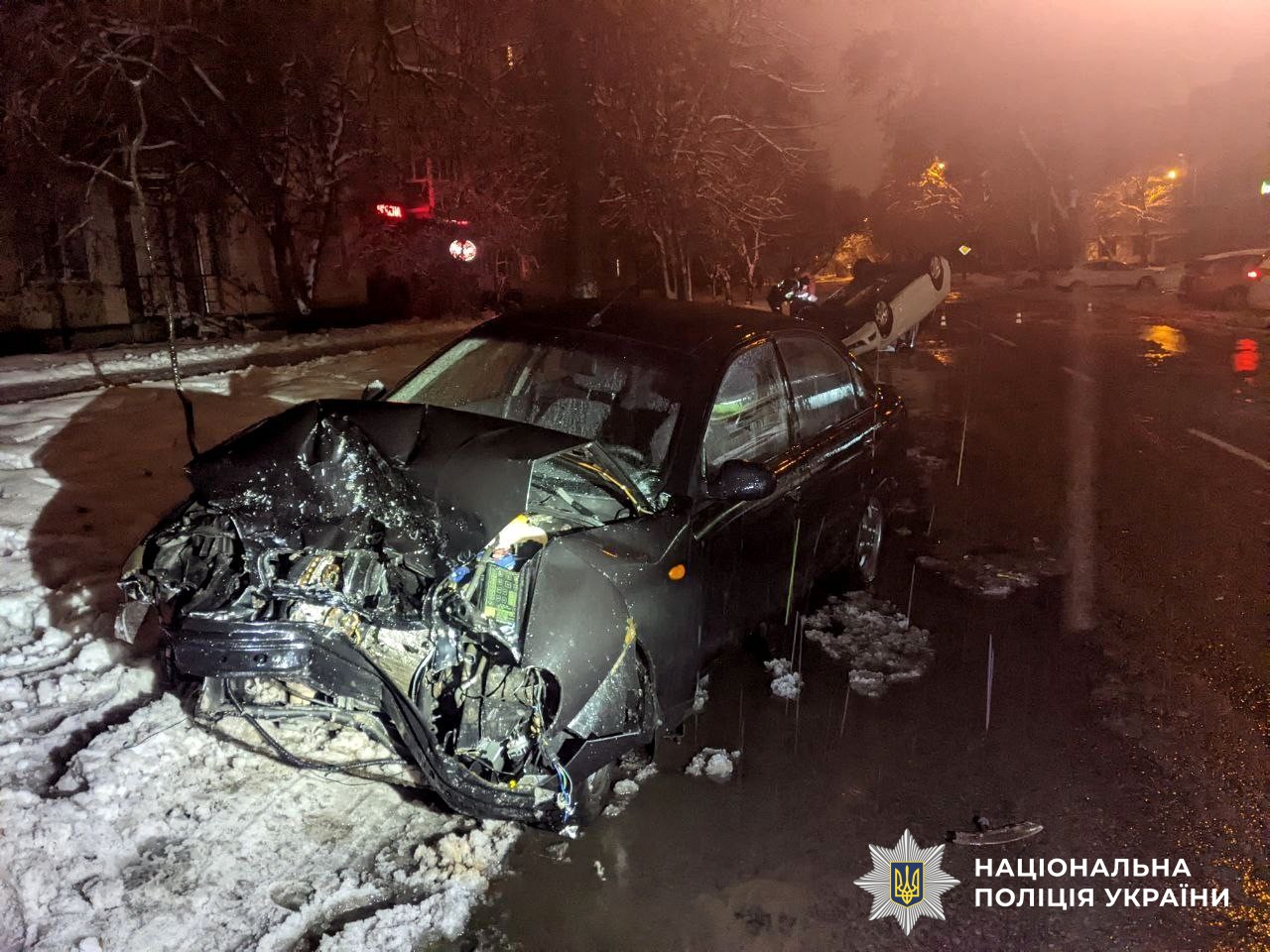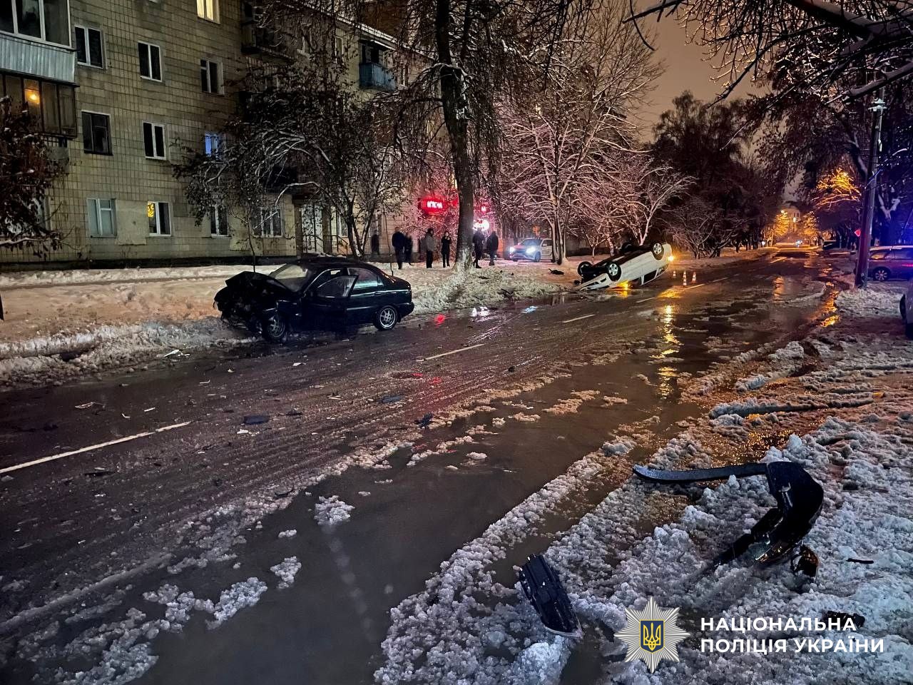 Поліцейські встановили, що 36-річний рівнянин, водій автомобіля «Skoda Oktavia», на смузі зустрічного руху зіткнувся з «Daewoo Lanos». Від удару «Skoda» перекинулась на дах. Попередньо, зі слів водія, він не впорався з керуванням на слизькій дорозі.
