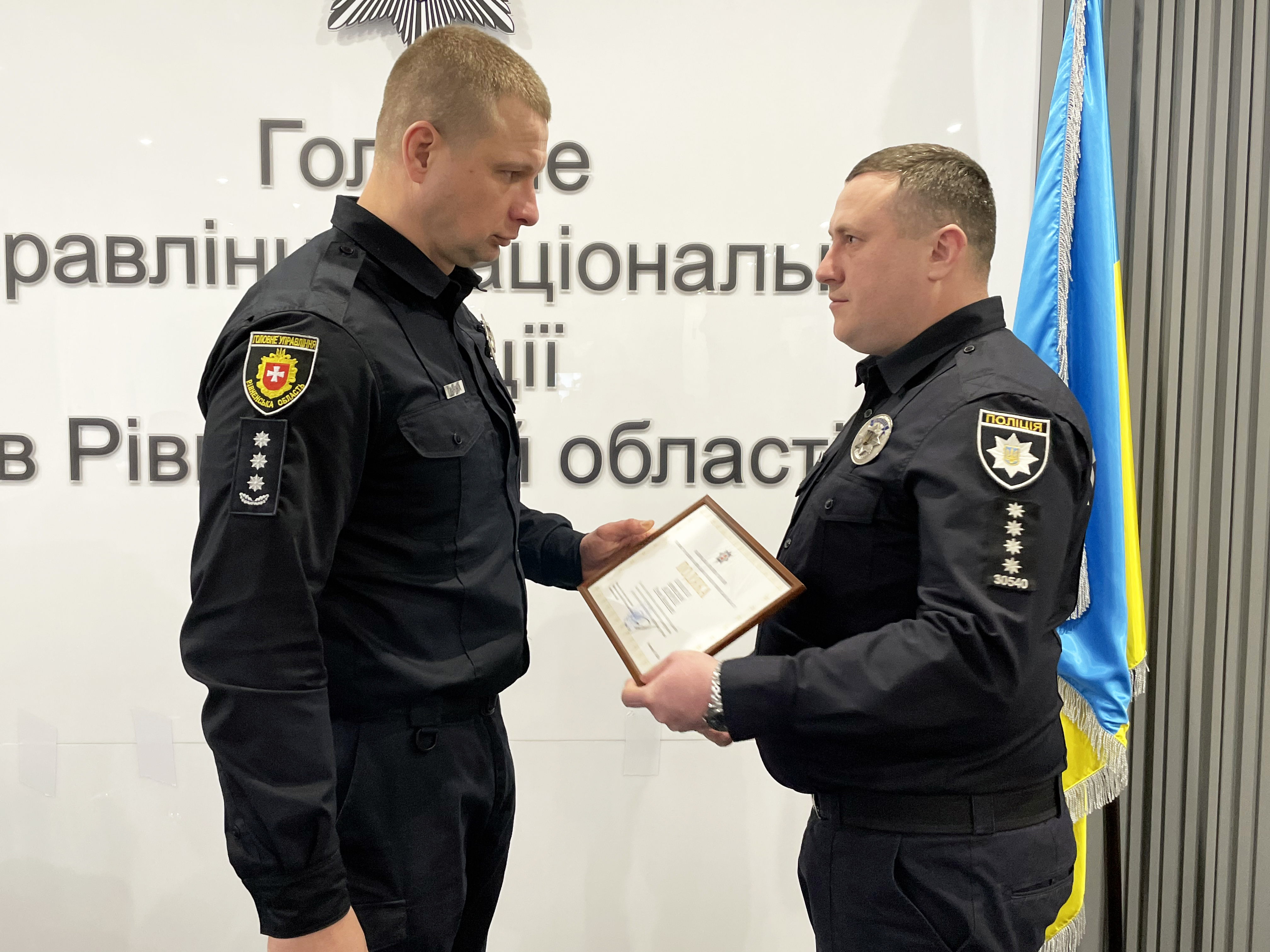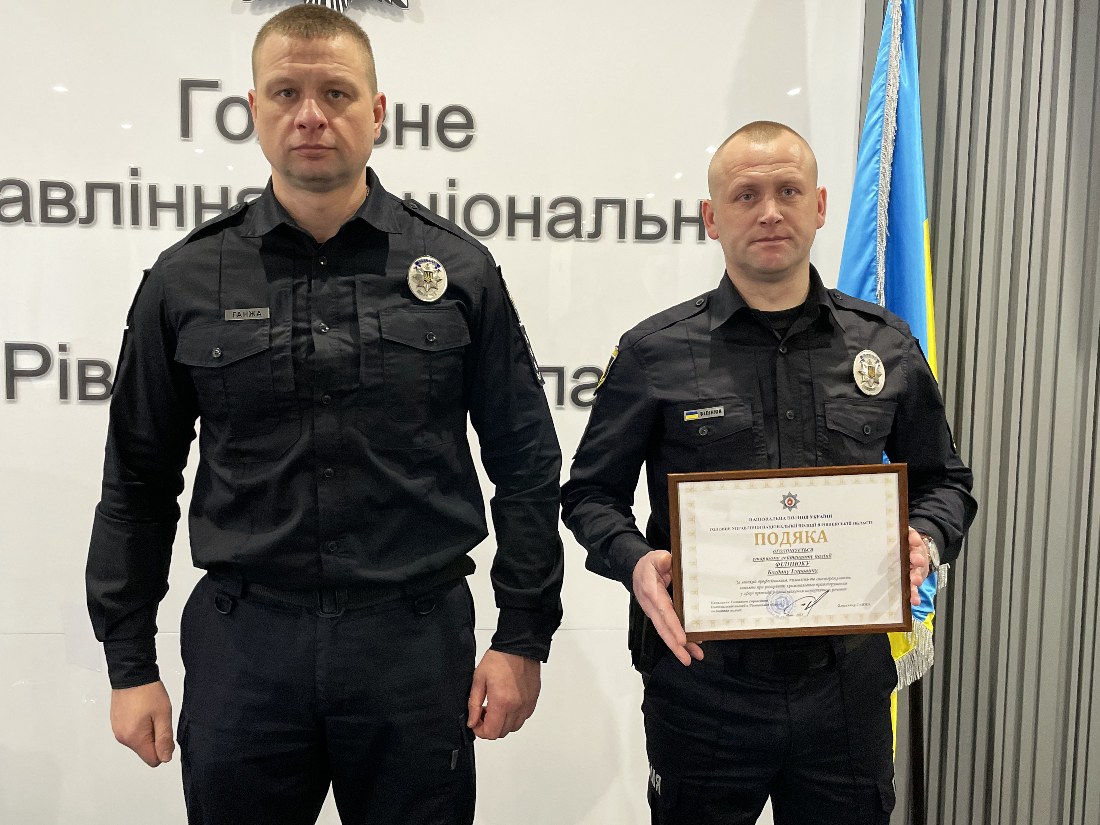Відтак, за професіоналізм, пильність та спостережливість, проявлені під час розкриття кримінального правопорушення у сфері протидії розповсюдженню наркотичних речовин, начальник поліції Рівненщини Олександр Ганжа вручив подяки старшому лейтенанту поліції Богдану Філінюку та капітану поліції Роману Андрійчуку.
