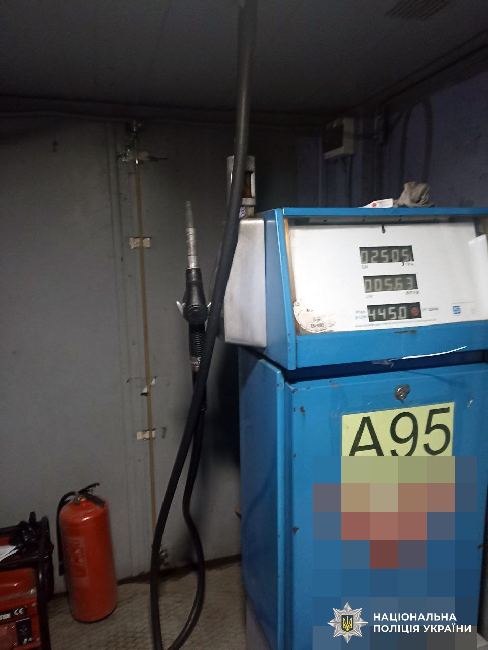 У металевому контейнері була облаштована міні-АЗС, а 60-річний оператор, місцевий житель, саме відпускав клієнту бензин. Жодних дозвільних документів він поліцейським не надав.