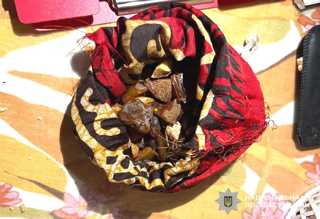 У рамках кримінальних проваджень поліцейські провели санкціоновані обшуки за місцями проживання зловмисників, під час яких вилучили пристрої для вживання наркотичних речовин, висушений канабіс та грошові кошти, отримані від збуту, зіп-пакет з речовиною рослинного походження та пів кілограма каміння бурштину.