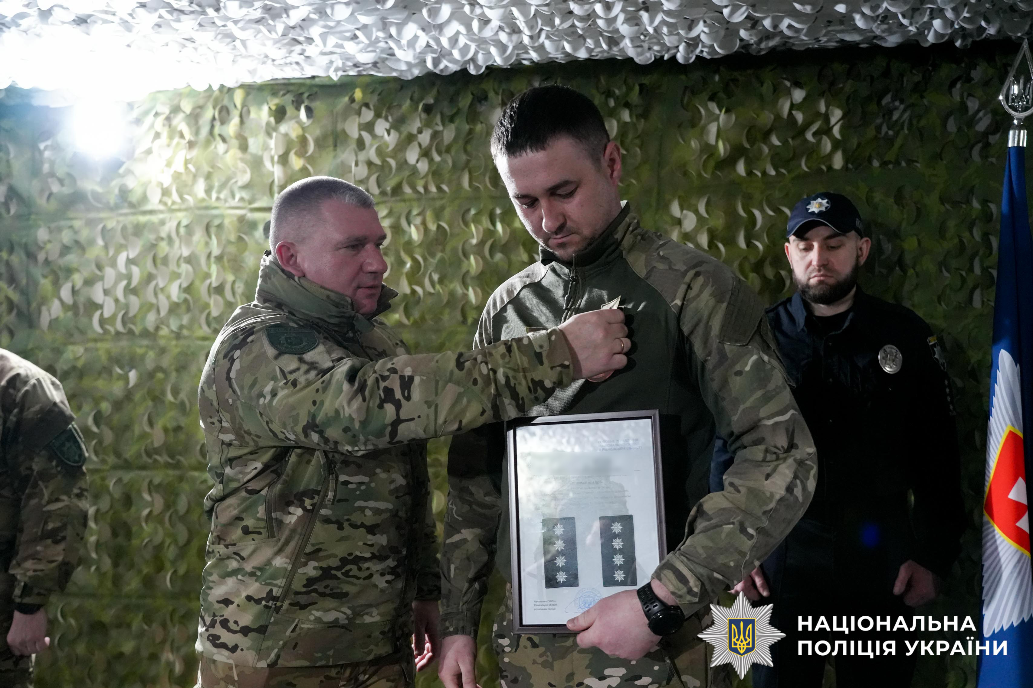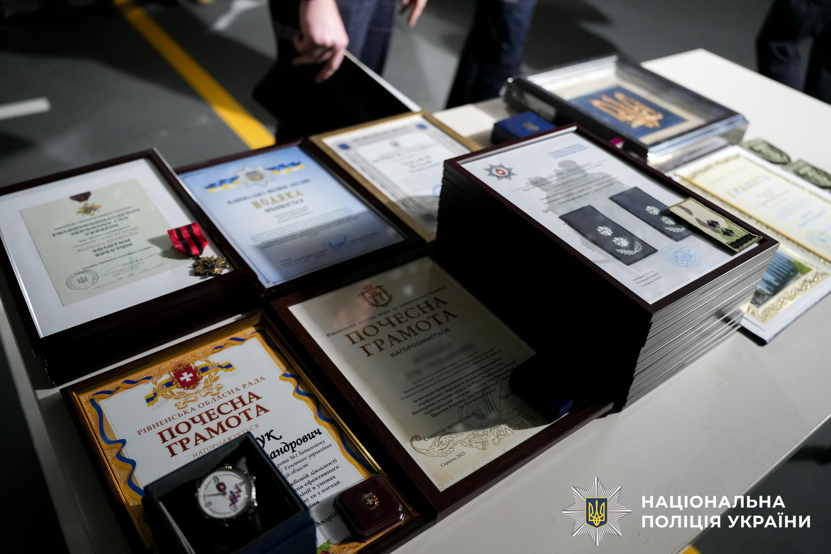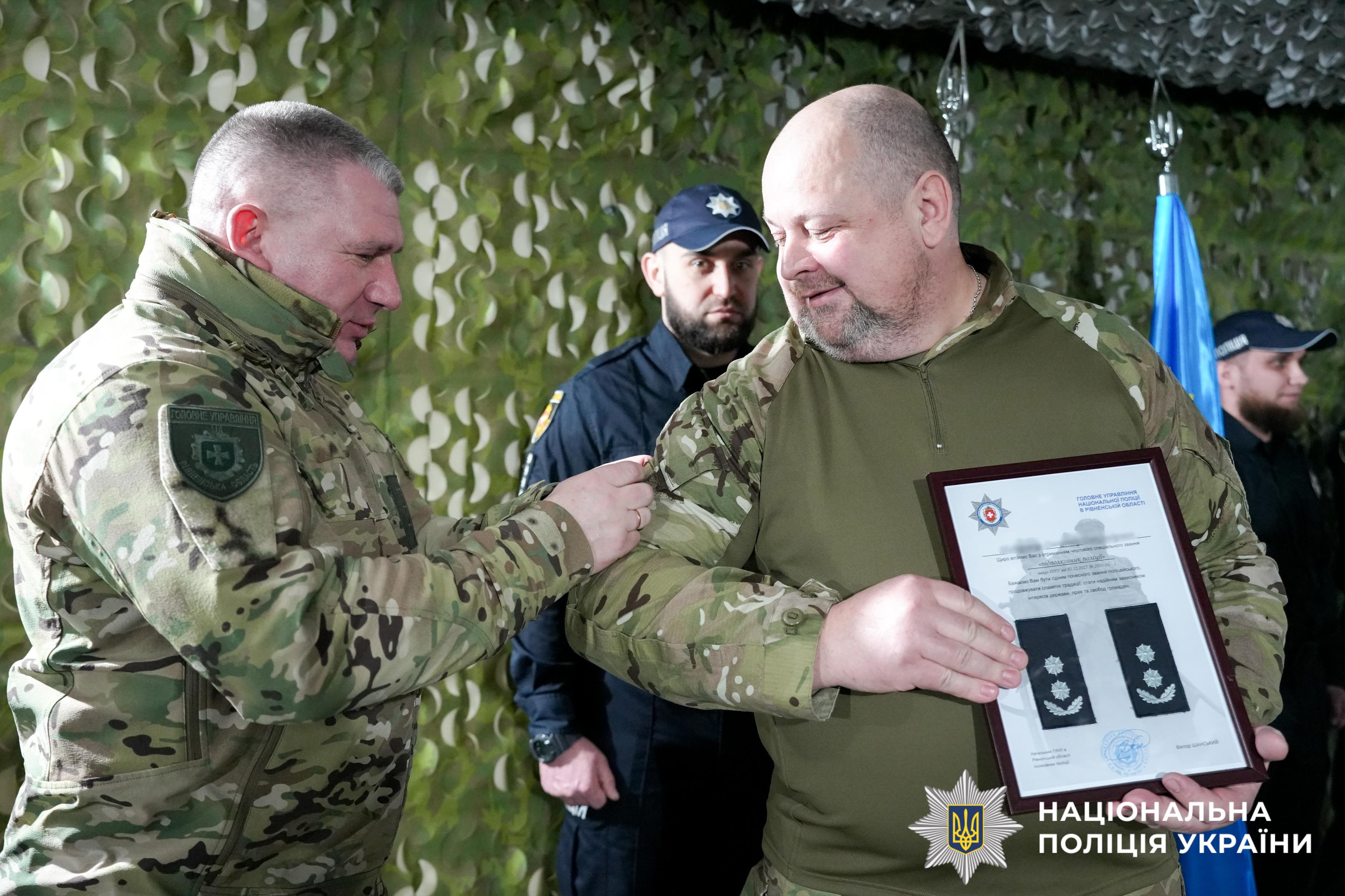 Крім того, за сумлінне виконання службових обов’язків, високий професіоналізм, захист територіальної цілісності держави керівник поліції Рівненщини вручив бійцям почесні грамоти, нагрудні знаки та цінні подарунки від Національної поліції України, обласної, районної та міської рад. Іще 14 поліцейських отримали чергові спеціальні звання.