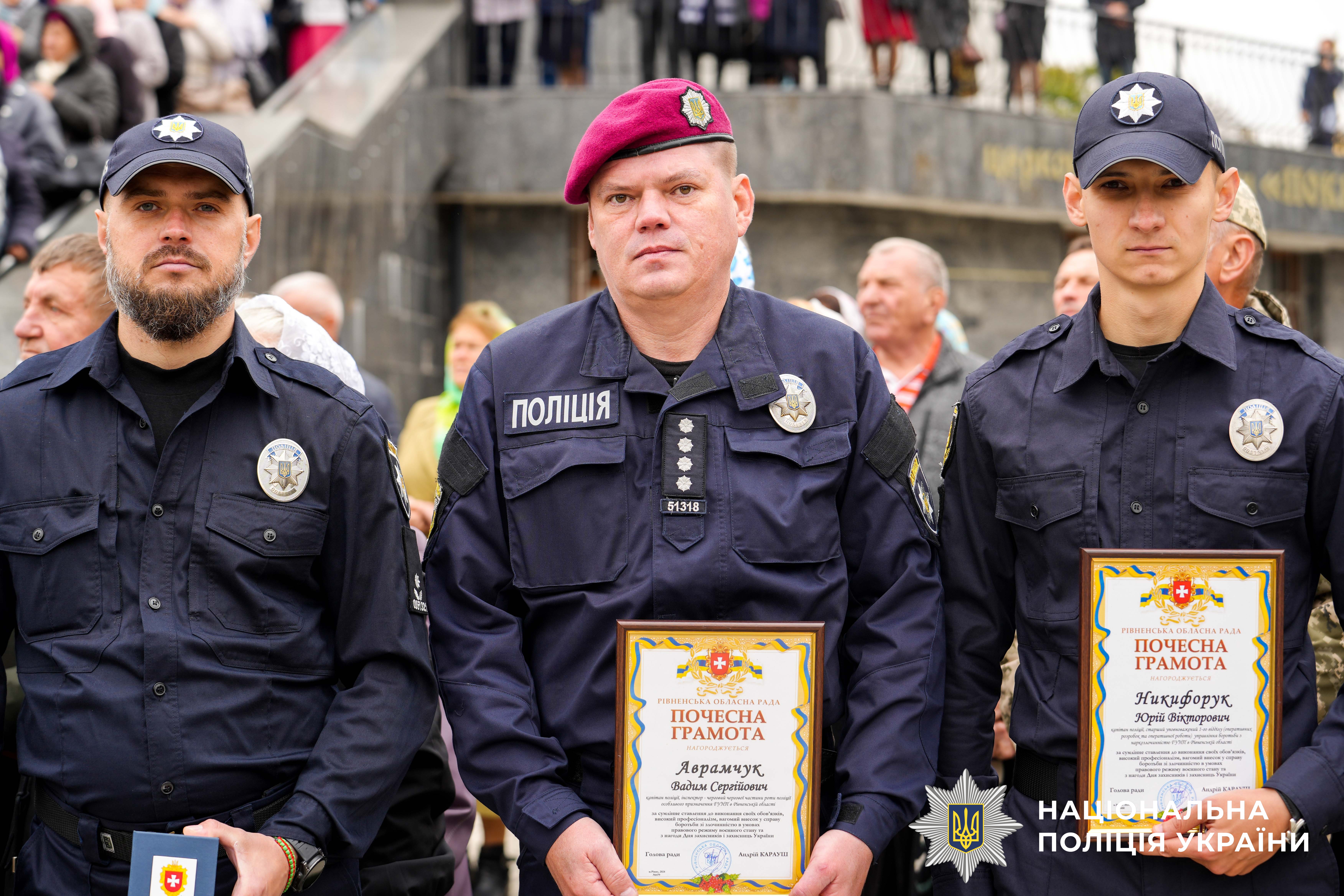 До урочистих заходів долучились керівники області, силового блоку, духовенство та громадськість. Голова Рівненської ОВА Олександр Коваль вручив захисникам відзнаки, серед яких — троє поліцейських.