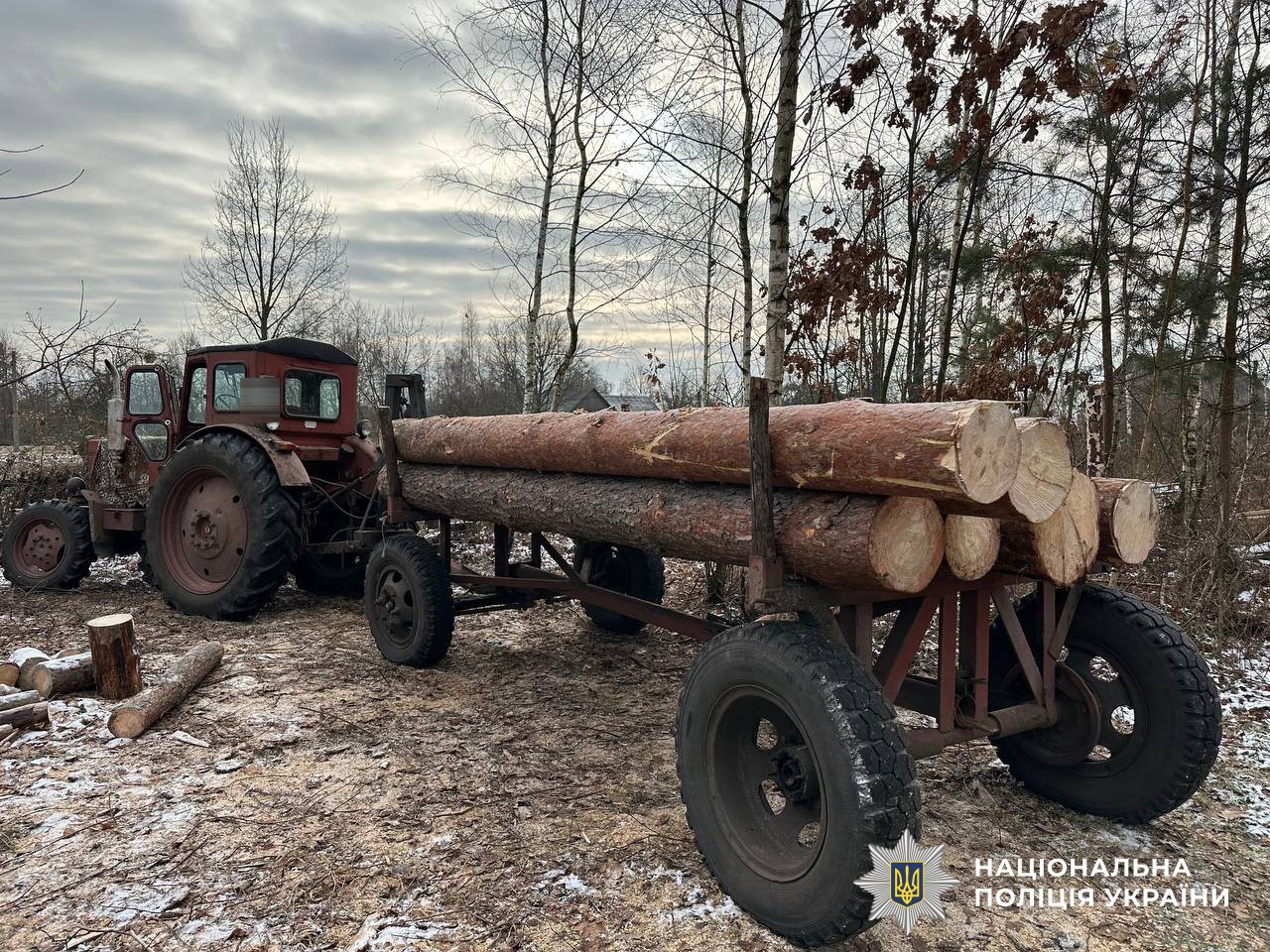 Крім того, на незаконній порубці лісу поліцейські викрили місцевого жителя у лісовому масиві поблизу села Великі Озера. Із місця події вилучили трактор з причепом і 16 свіжозрізаних дерев сосни та знаряддя злочину.