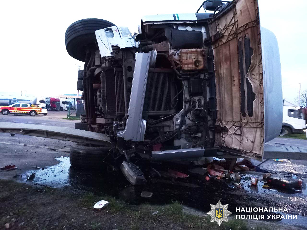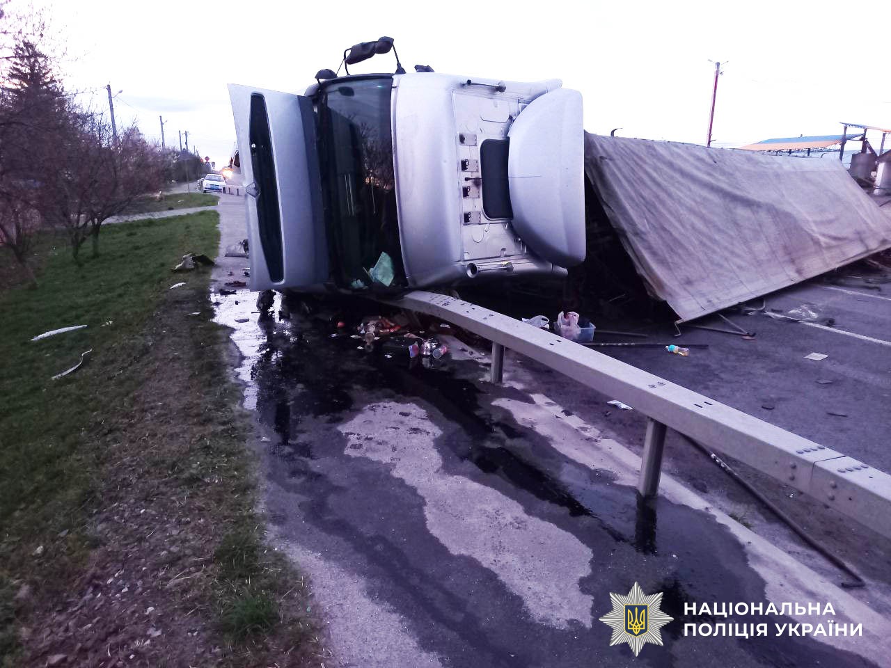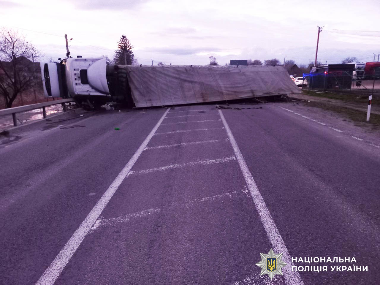 Вантажівка внаслідок удару перекинулась та перекрила трасу.