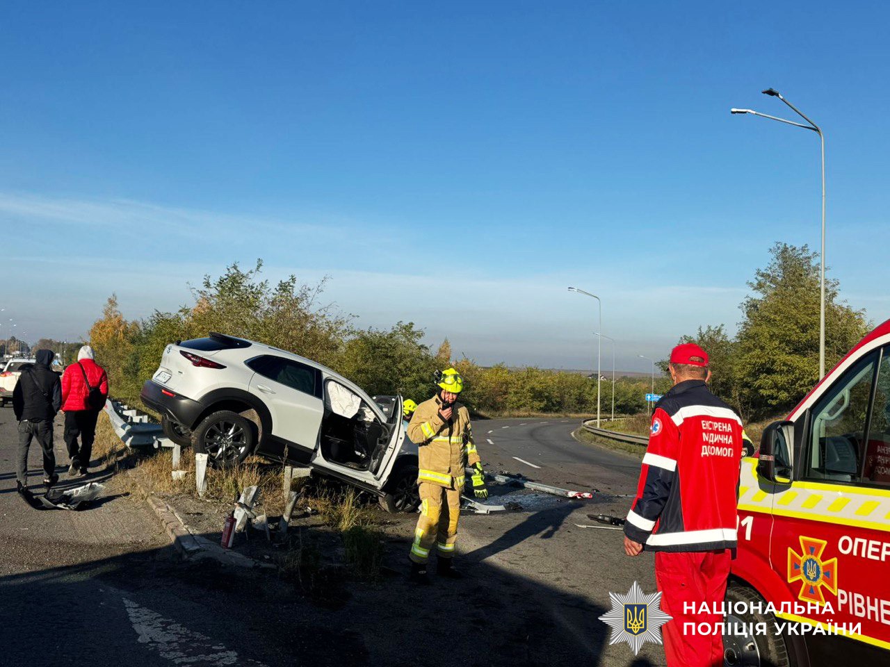 Попередньо встановлено, що водійка автомобіля «Mazda» 48-річна, жителька міста Київ, не дотрималась безпечної швидкості, не впоралась з керуванням та в’їхала у відбійник.