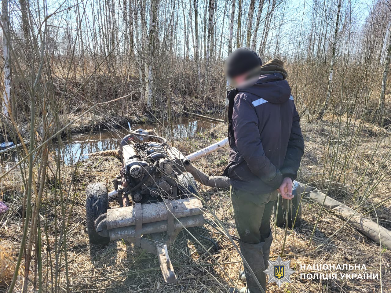 Так, близько 16 години 16 березня під час відпрацювання територій щодо недопущення вчинення злочинів у сфері довкілля в урочищі «В’язок» неподалік села Томашгород правоохоронці виявили 18-річного жителя села Томашгород, який за допомогою мотопомпи видобував бурштин.