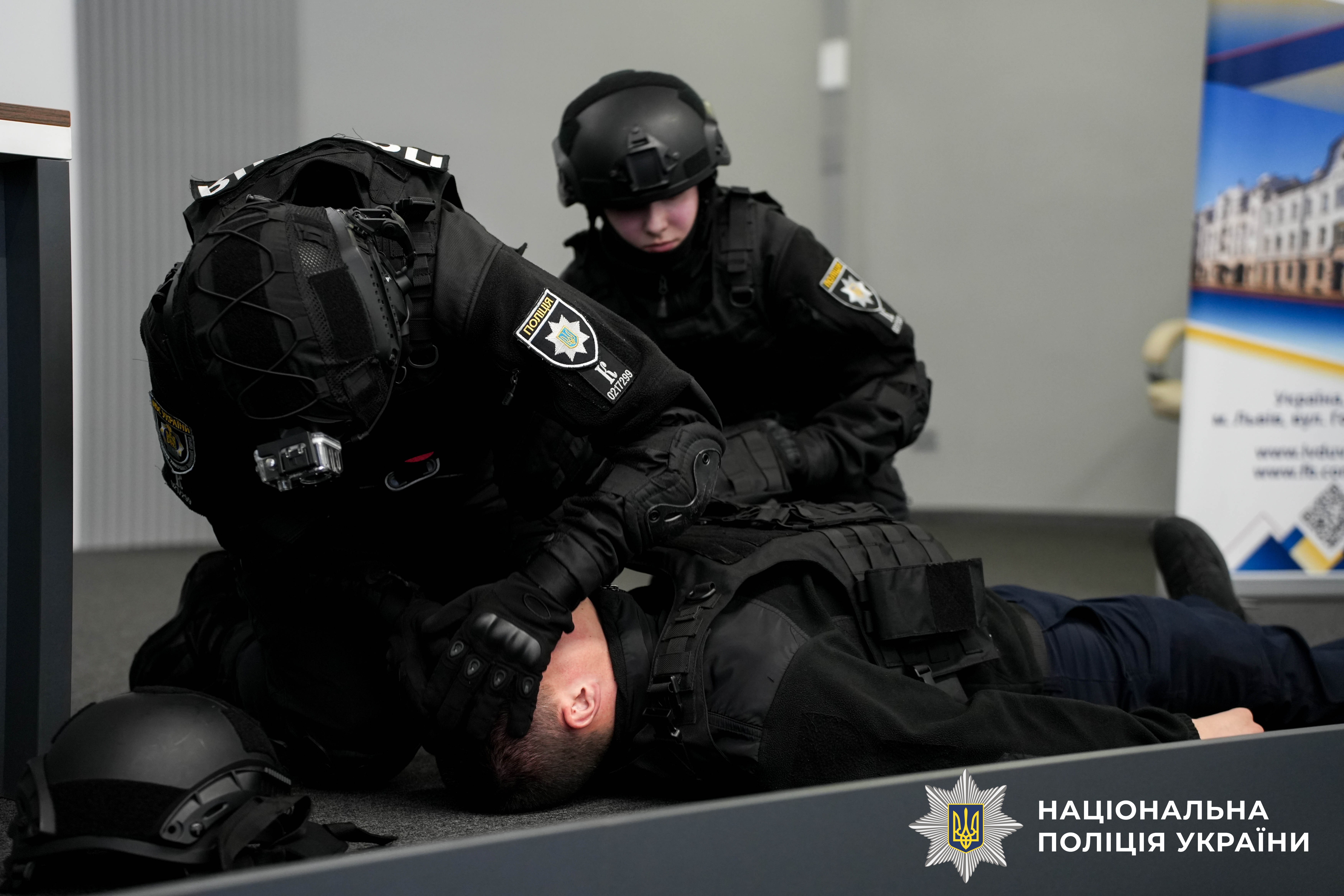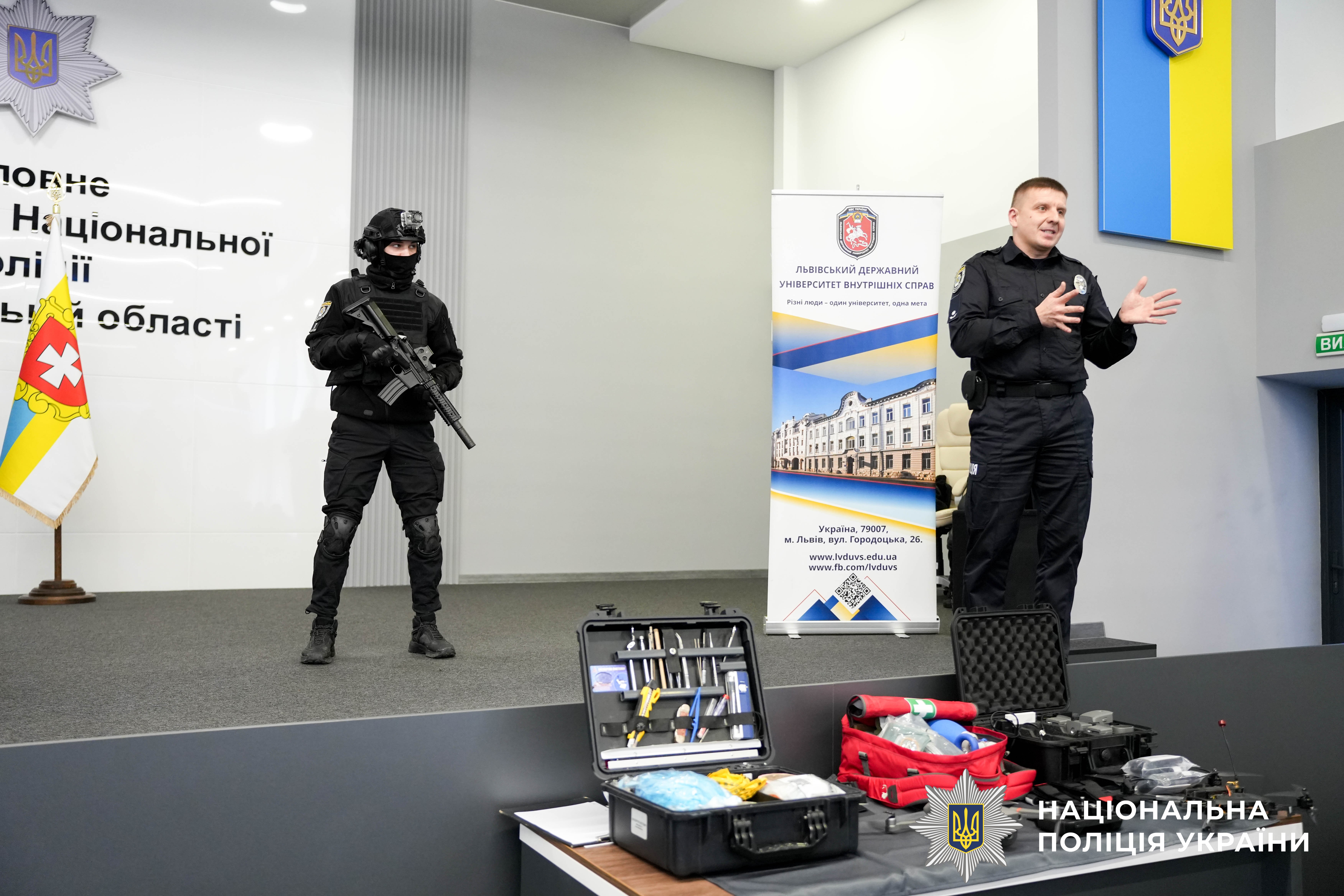 На зустрічі були також присутні завідувач відділення організації роботи з професійної орієнтації Юлія Качанівська, т.в.о. заступника декана факультету Михайло Шевців, завідувач кафедри тактико-спеціальної підготовки Мар’ян Курляк, які ознайомили присутніх зі спеціальностями вишу, умовами вступу та освітніми можливостями ЛьвДУВС. Також на практиці продемонстрували прийоми рукопашного бою.