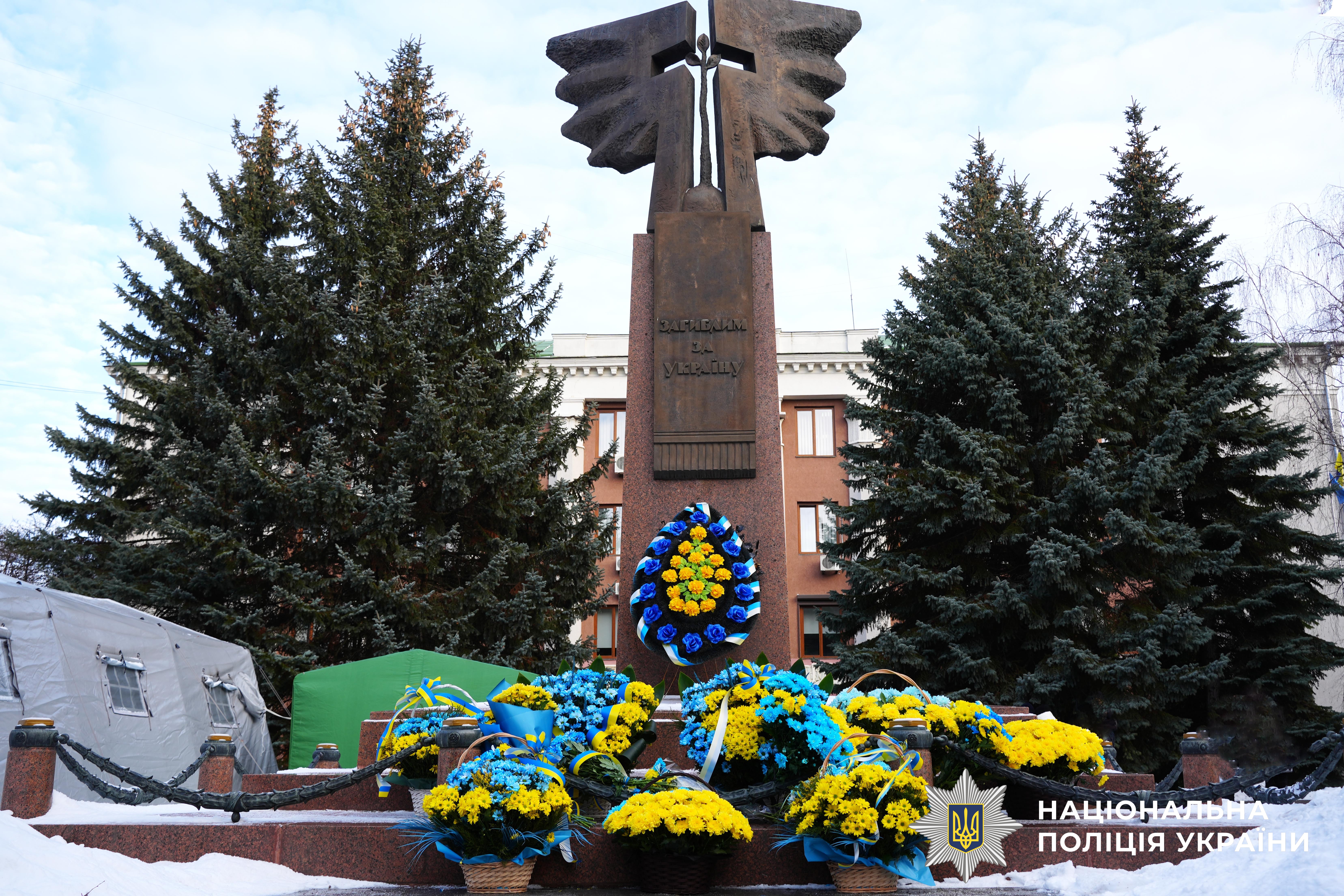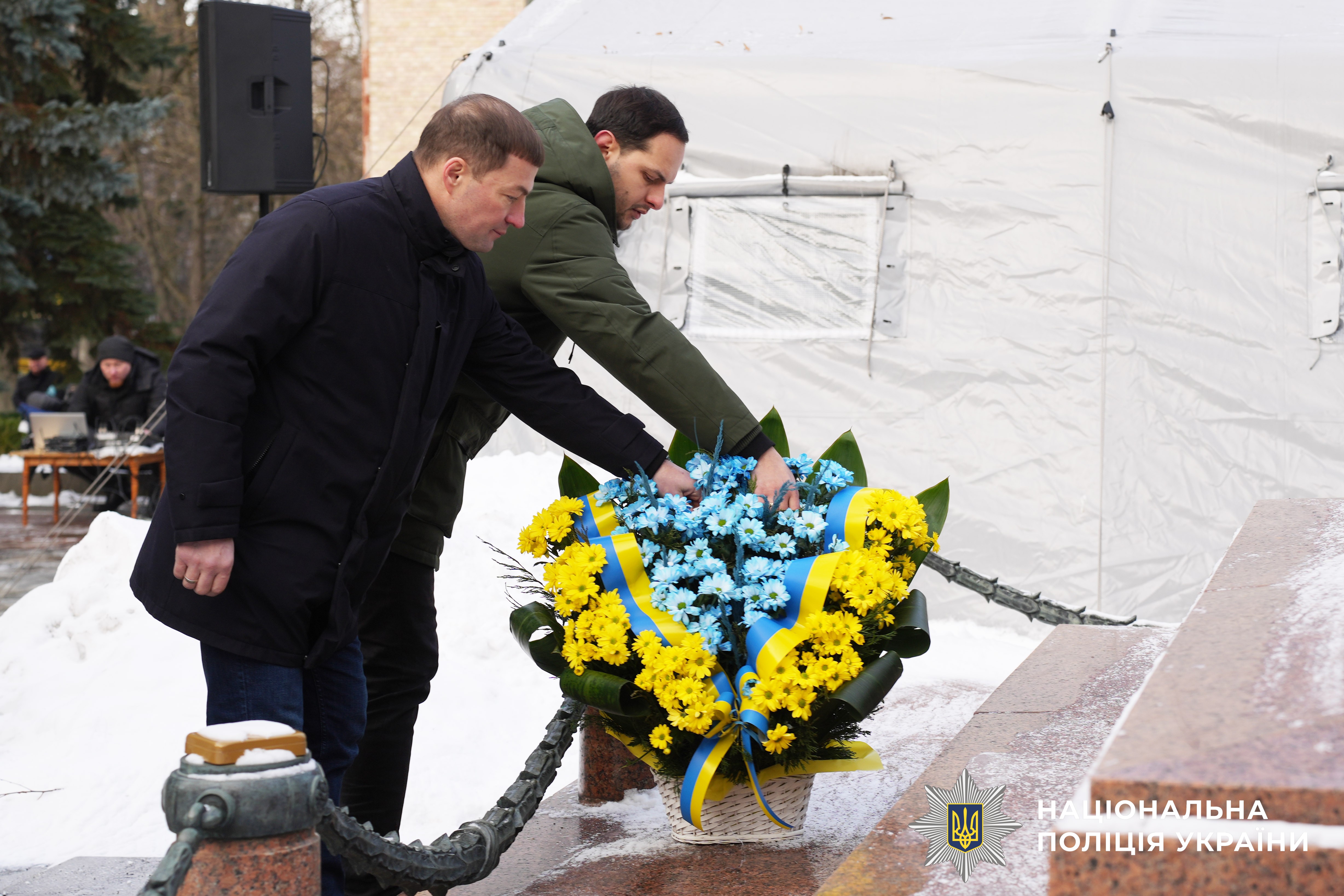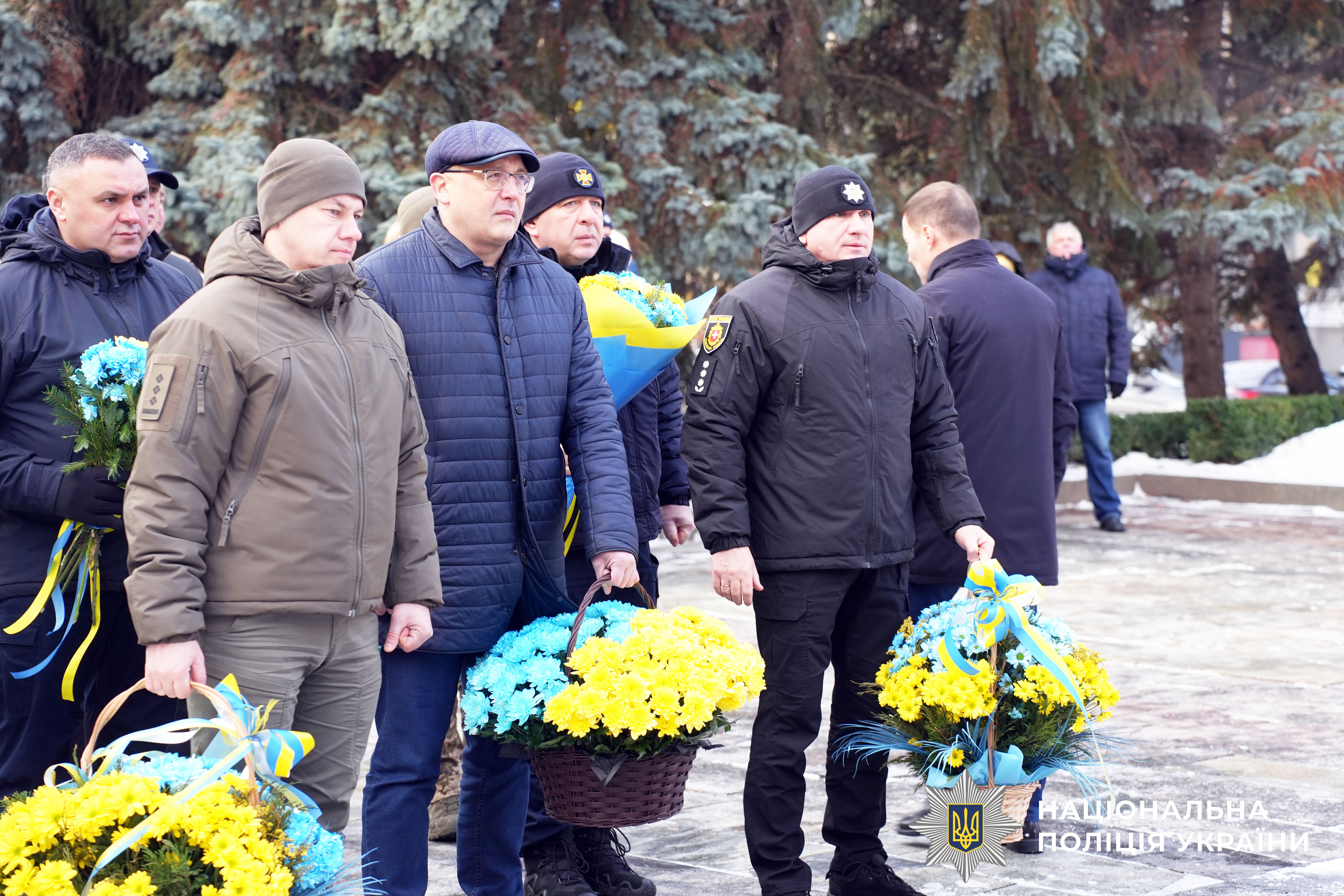 Керівник поліції Рівненщини Віктор Шанський, перші особи міста та області, представники силових структур та громадськість поклали квіти до пам’ятника «Загиблим за Україну» на майдані Магдебурзького права, вшанувавши подвиг українців, які боролися за єдність територій, єдність цінностей і право жити у незалежній державі.