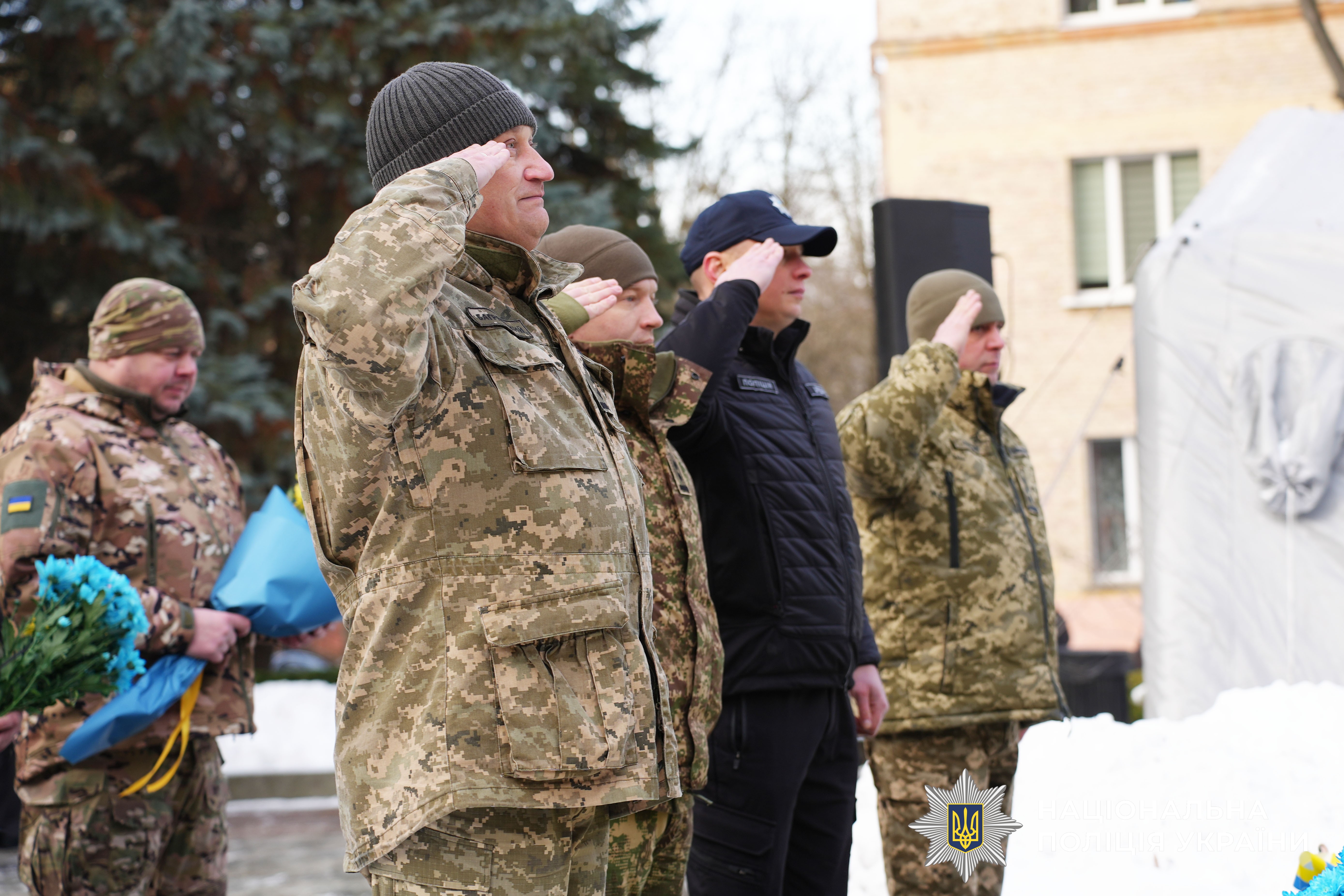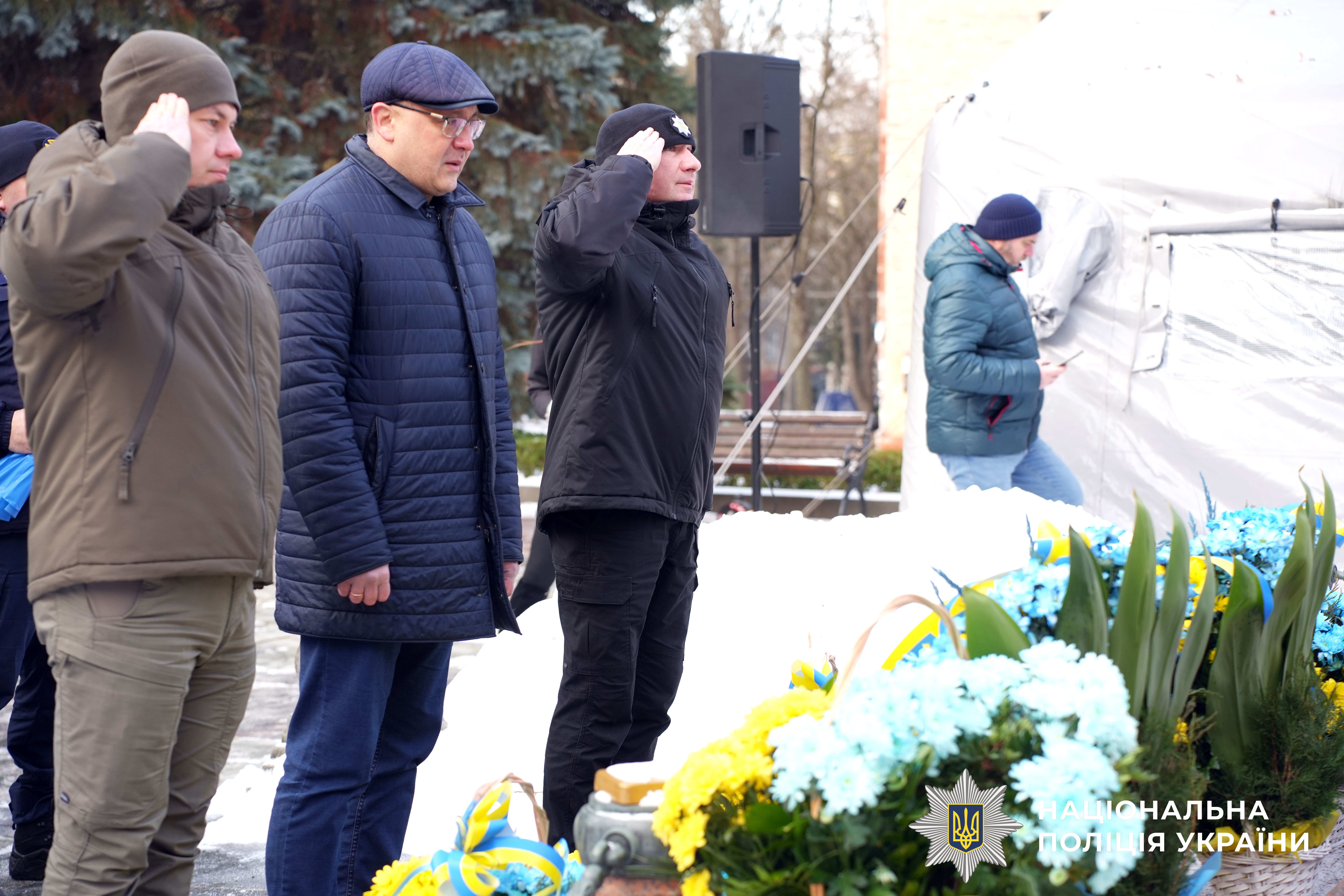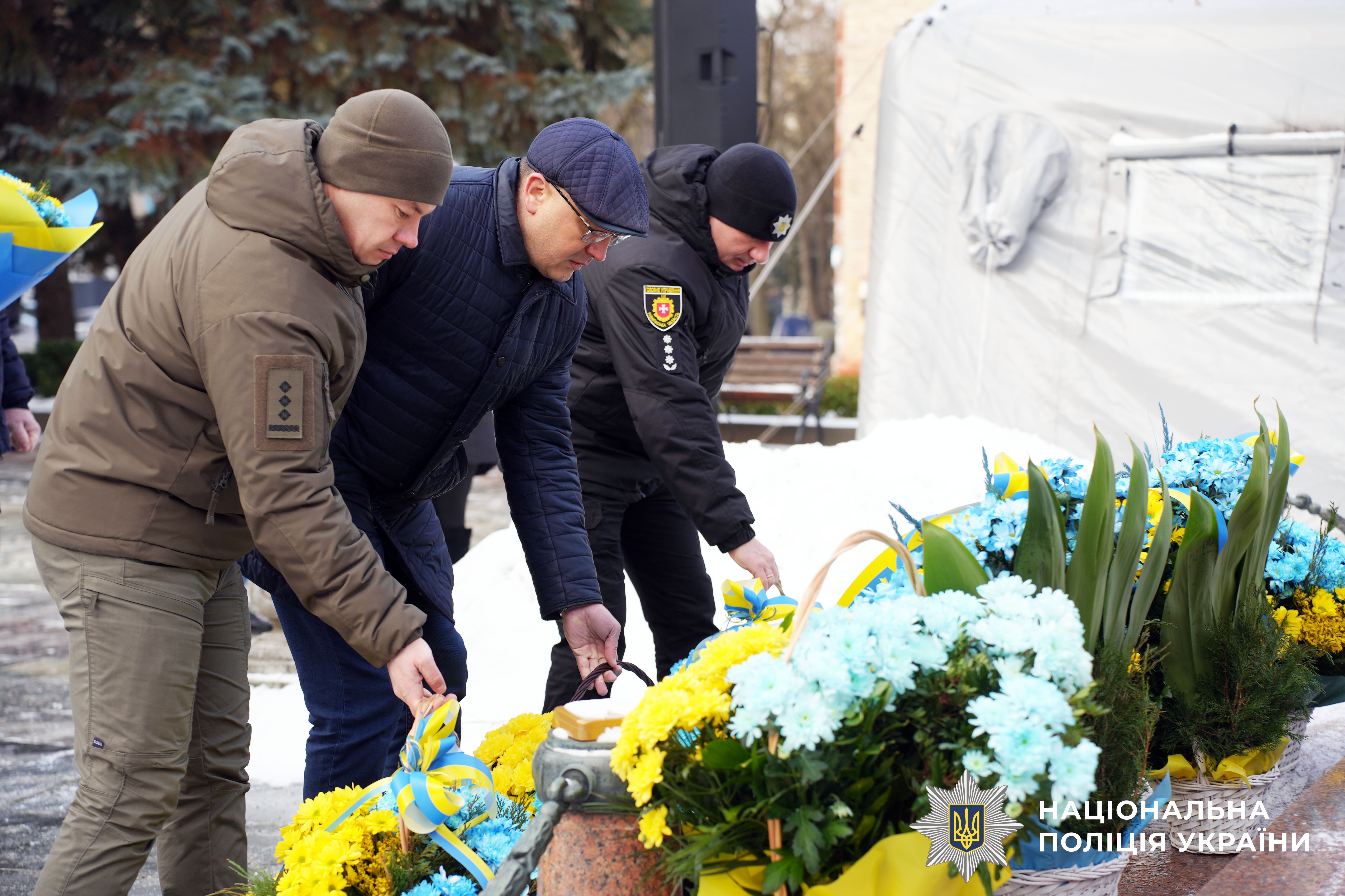 Керівник поліції Рівненщини Віктор Шанський, перші особи міста та області, представники силових структур та громадськість поклали квіти до пам’ятника «Загиблим за Україну» на майдані Магдебурзького права, вшанувавши подвиг українців, які боролися за єдність територій, єдність цінностей і право жити у незалежній державі.