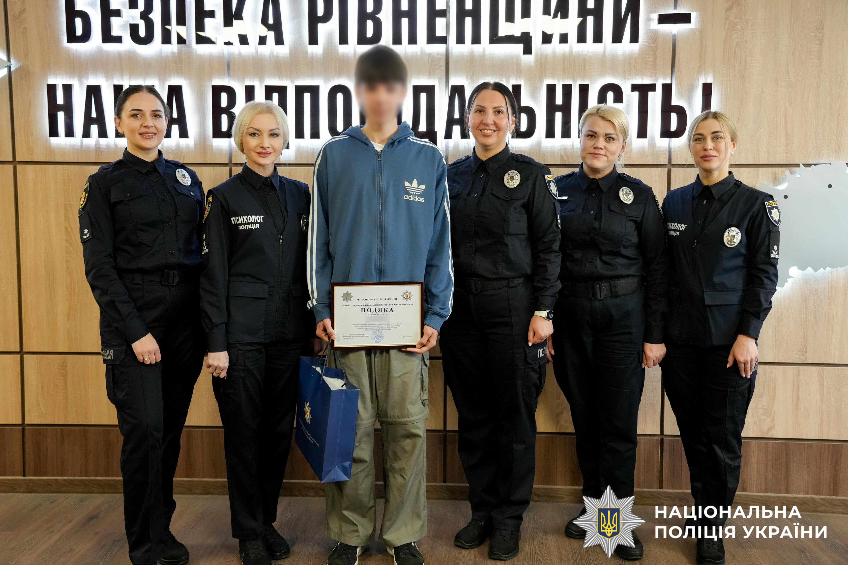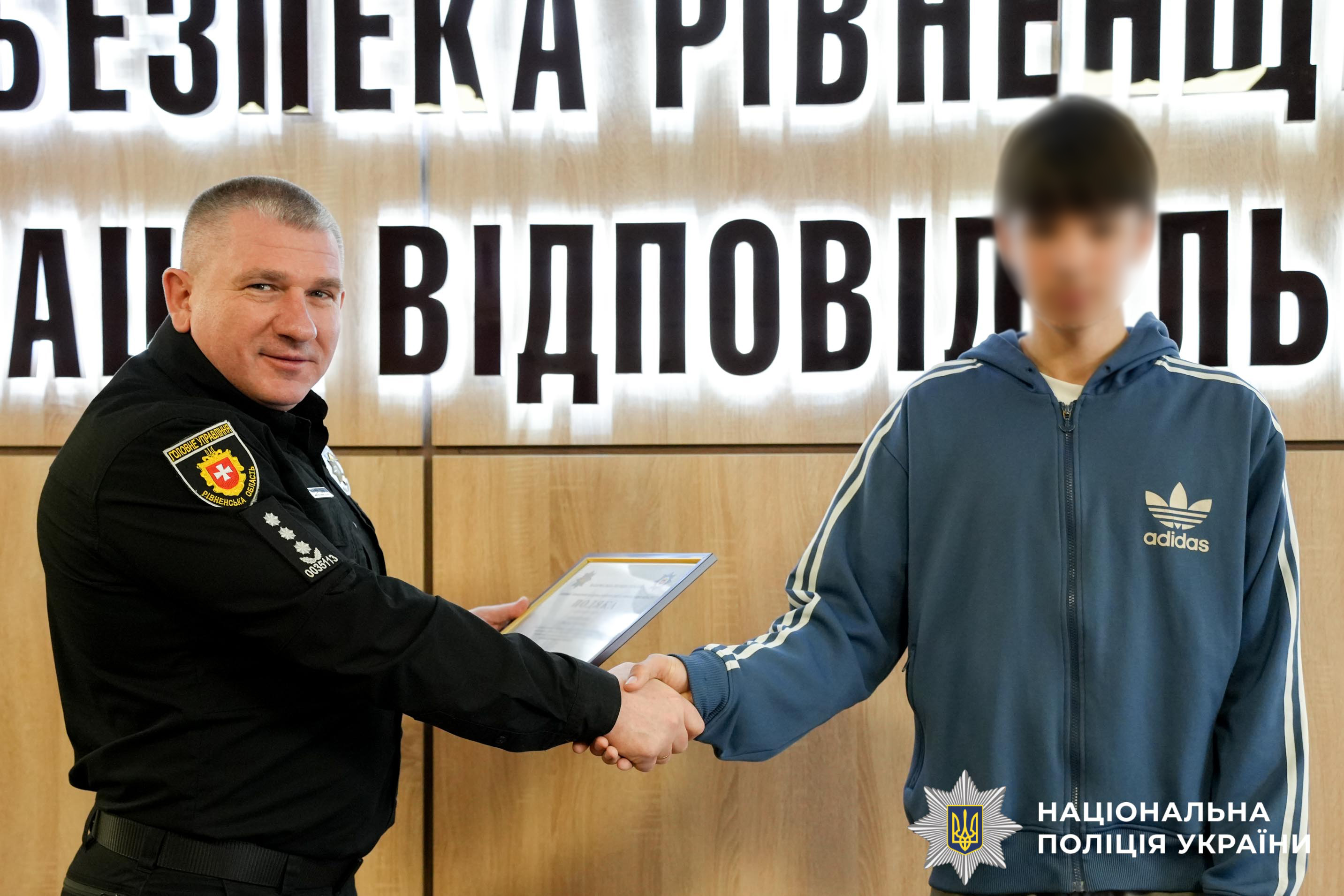За проявлену небайдужість і відповідальність начальник ГУНП в Рівненській області нагородив підлітка подякою та вручив подарунки — навушники, павербанк і солодощі.