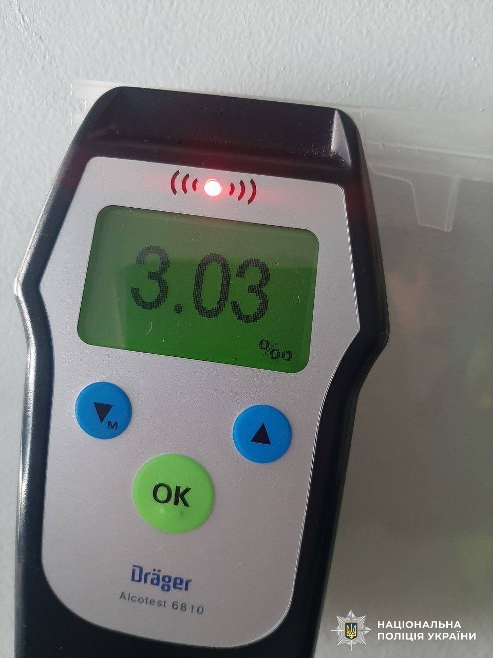 Під час огляду на стан сп’яніння алкотестер «Drager» зафіксував 3,3 проміле, що у понад 16 разів перевищує допустиму норму.