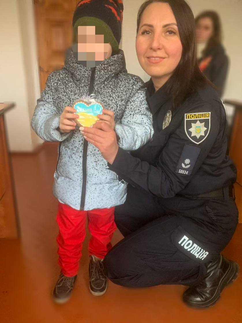Побачивши поліцейську Артем, якому сьогодні виповнилося п’ять років міцно її обійняв. Аби заспокоїти дитину інспекторка пригостила його патріотичними солодощами.