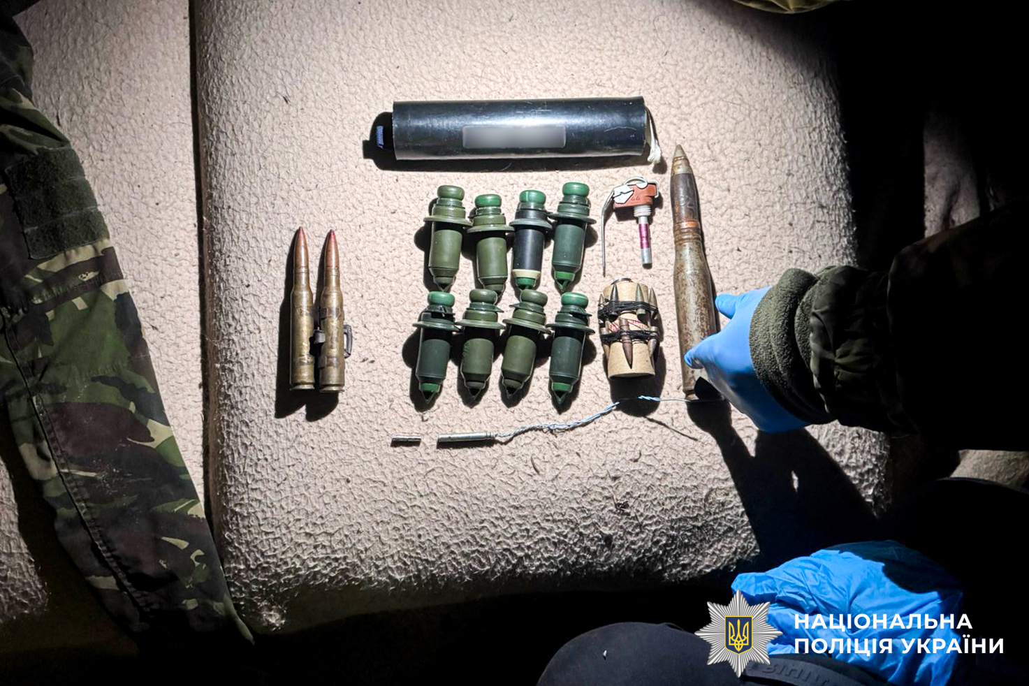 У ході проведення невідкладного обшуку за місцем мешкання військового, поліцейські вилучили димову гранату, артилерійський постріл, запал до гранати електродетонатор, сповільнювач до підривача, імітаційну протипіхотну міну, 18 куль різного калібру, 8 боєприпасів та 2 патрони.