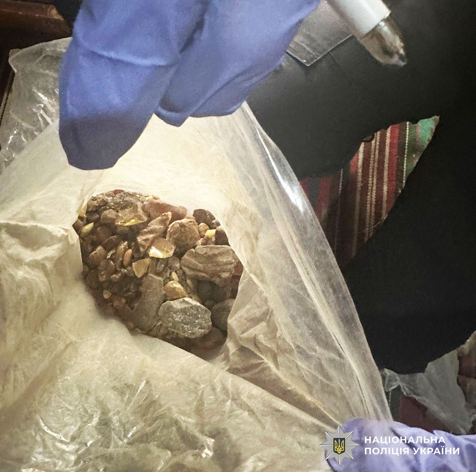 Крім того, в ході санкціонованого обшуку у будинку 35-річного дубровиччанина поліцейські вилучили корпус гранати Ф1 й запал до неї, а також орієнтовно кілограм каміння бурштину-сирцю.