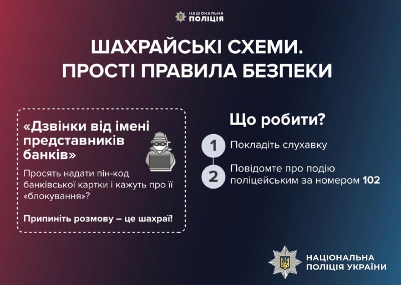Правоохоронці вчергове наголошують і застерігають: якщо вам телефонують із будь-якими питаннями стосовно ваших банківських рахунків, перервіть розмову і сконтактуйте з представником фінустанови за вказаним на звороті картки номером.