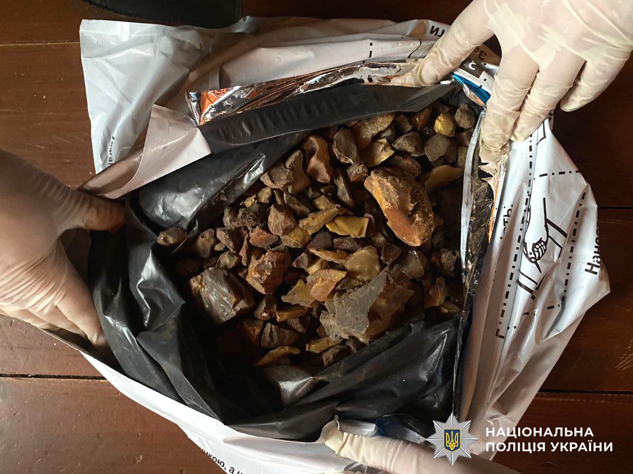 Під час обшуків у підозрюваних вилучили орієнтовно два кілограми каміння бурштину-сирцю та зброю. Крім того, у господарстві обох були ємності, наповнені дизелем.